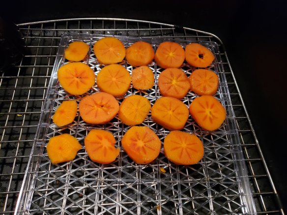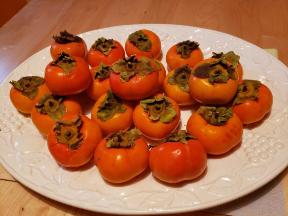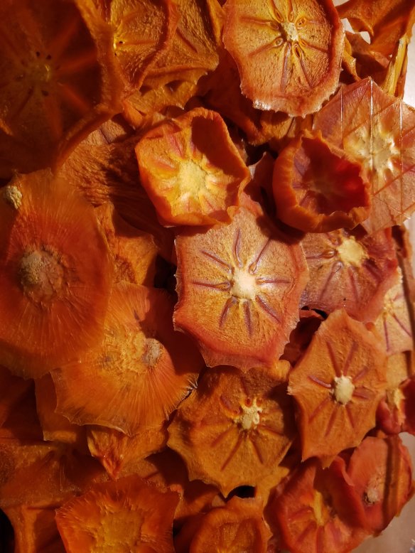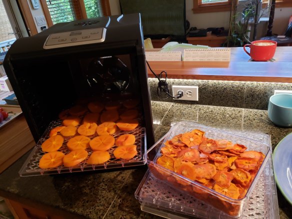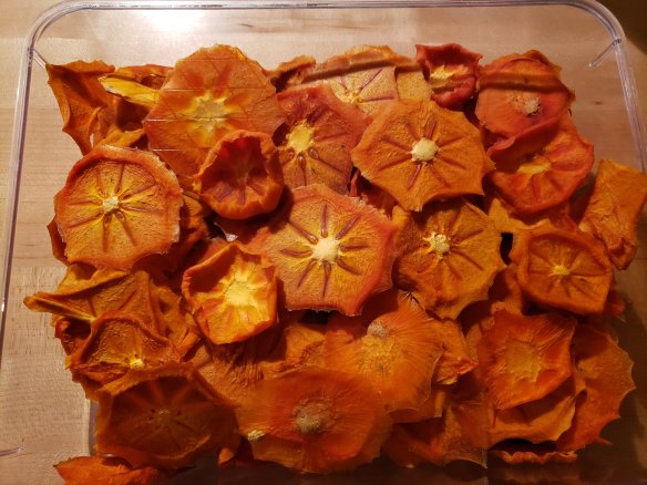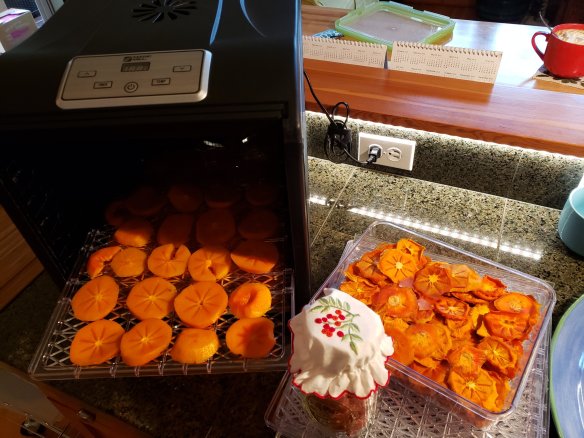 We’re still in persimmon heaven here. I think my husband counted about 450 from the Japanese Fuyu Persimmon he planted about 10 years ago. We have decided they are the mango of the Pacific NW. Once dried they are sugar sweet and taste like mango. We love them fresh and dried. I also made fruit roll from them yesterday, but I will post that another time.