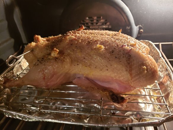 3. Place duck, breast side up, on a rack set on a shallow roasting pan. Roast duck, removing bird from oven every half hour to turn allowing it to roast until it reaches an internal temperature of 165 degrees.