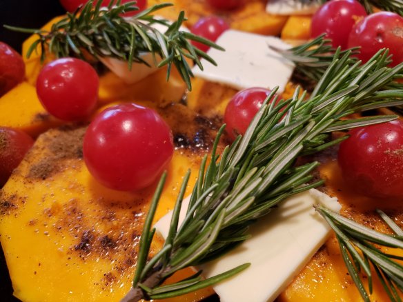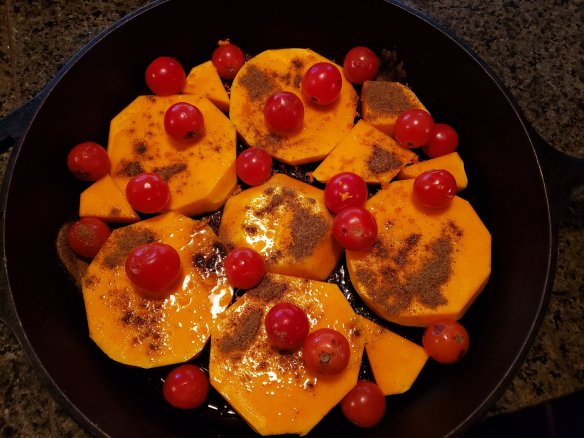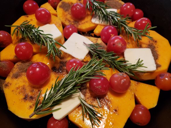 Yesterday I baked this wonderful butternut and I also had baby tomatoes I needed to use up. I was not sure how the butternut and tomatoes would compliment each other, but if you add rosemary and garam masala, each of those in their own right work their magic. It was so delicious I forgot to take a pic after oven baking it! We just dug right in. I love roasted veggies, anything I can prepare ahead and not fuss with. Regarding prep… cutting up the butternut is the longest part! I’m sure any squash would work well, this butternut was given to us by a fellow community gardener in exchange for the awesome tomatoes my sweetie growns. We recieved it young and green. There is something so lovely to watch a veggie ripen in front of your eyes through autumn and then cook it, instead of from the grocers.