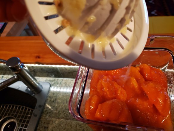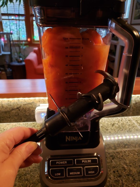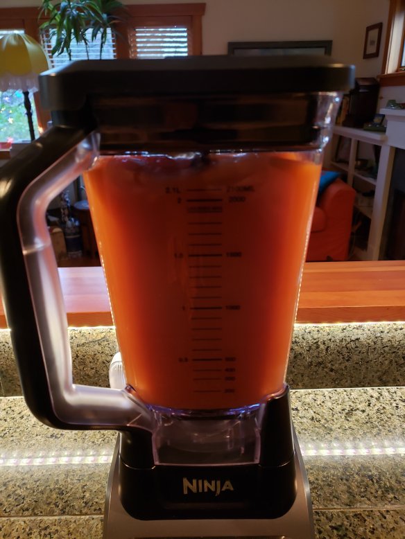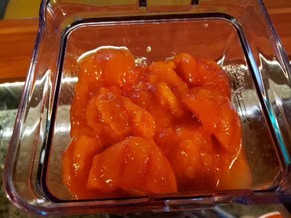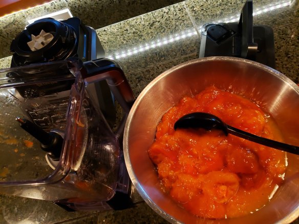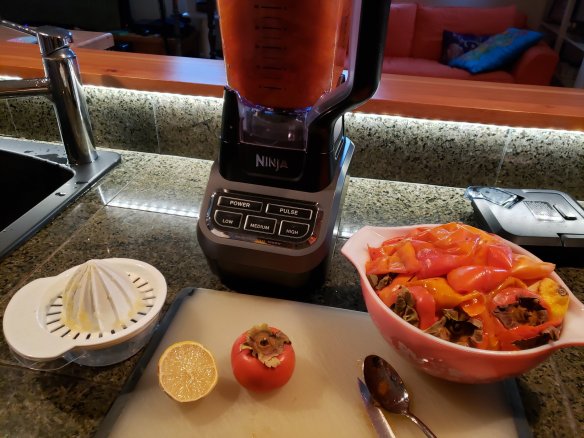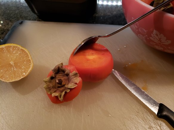 I should have counted how many persimmons I used, but I ended up with 9 cups of pulp that I blended with the juice of a whole lemon and the tip of a teaspoon handle of the concentrated version of stevia powder.
