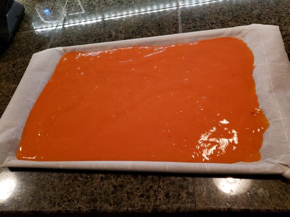 Line 2 cookie trays with parchment paper, pour in blended fruit and set oven to 200F.