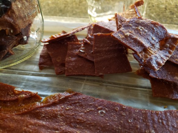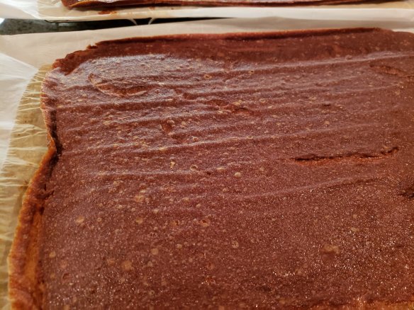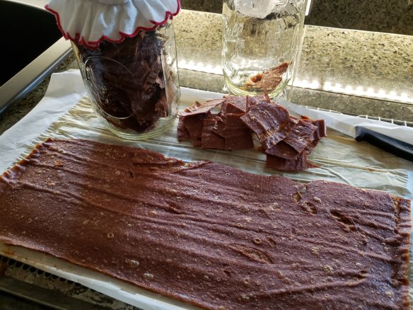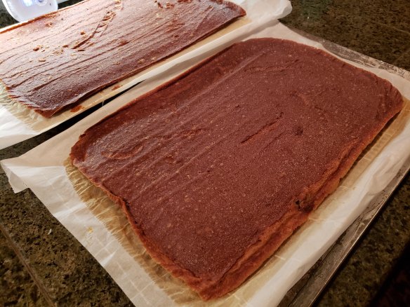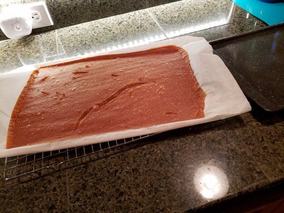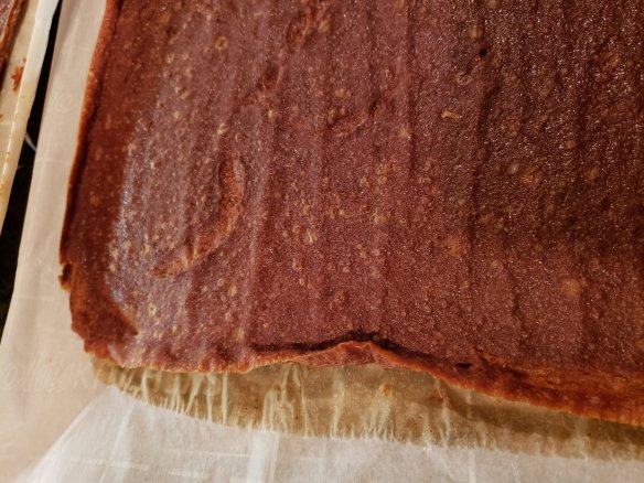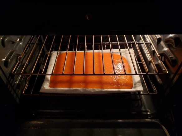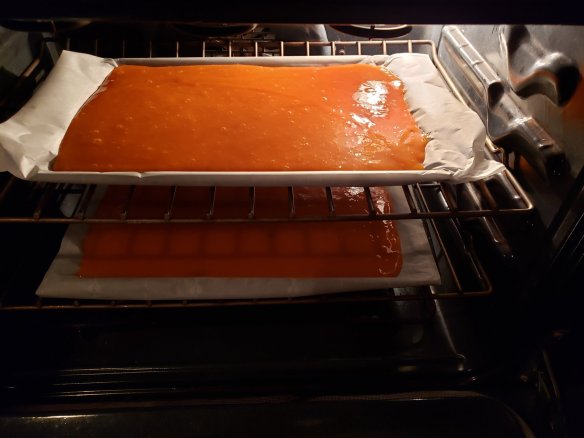 Here’s the thing, though. Making fruit leather in summer would not work, the oven runs for hours and you can use a dehydrator unit outside, I guess, but in winter it’s perfect for warming the house and it smells delicious. It is a very long drying process, though.