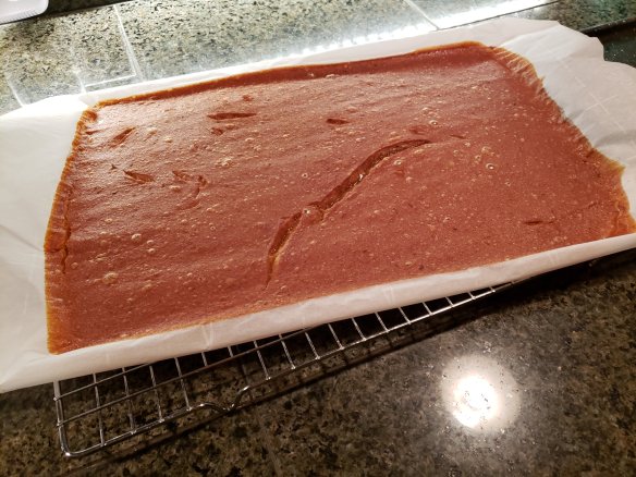 After 6 to 8 hours the fruit is set enough to move the parchment paper with the fruit on it, onto a drying rack … which you then put back in the oven until the fruit leather is dry enough to pull off the paper. It is a wet fruit and sweats underneath. Then after another two hours I pull the fruit leather off and flip it over to dry the underside. I assure you, the hassle is worth it!