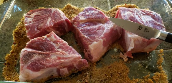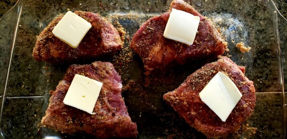 I had these wonderful but intimidatingly large pork loin chops. With some dry rub seasoning and butter they turned out tender and delicious.