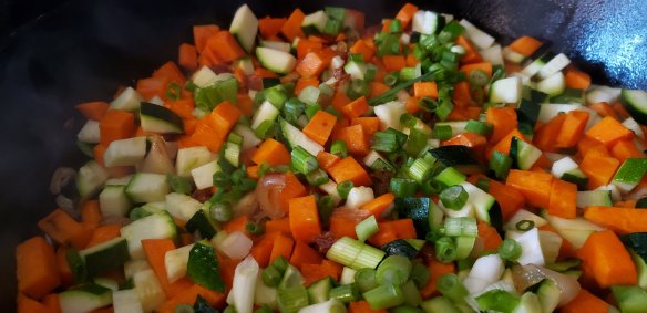 Finely dice all veggies, start off with frying the onions, garlic and when just soft add the diced sweet potato.