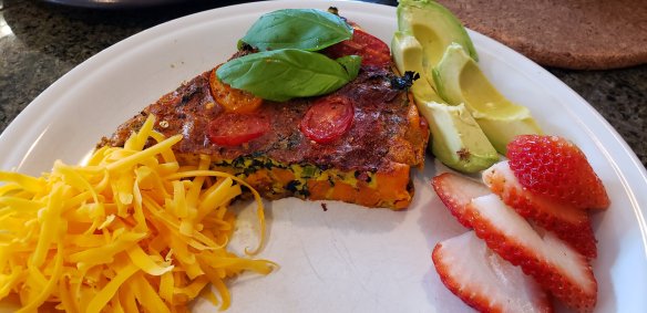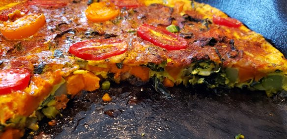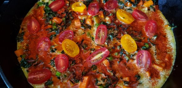 Beat eggs with cream and spices. Pour egg mix over cooked veg until covered. Top with sliced baby tomatoes cut side up or you can just use sliced tomatoes, sprinkle over paprika and Spanish or taco seasoning. Turn off pan.