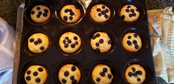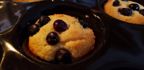 Pour or scoop batter into muffin pan and top with more blueberries.