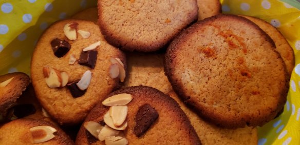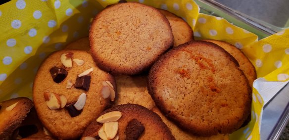 These soft cookies are a lovely texture and I added the zest of an orange at the end to the dough to make a change, and the second batch I topped with almonds and unsweetened chocolate bits. The first batch I baked plain. Makes about 30 +- cookies depending on your scoop size.