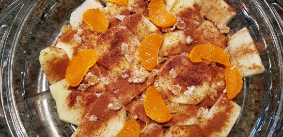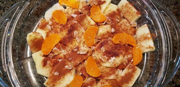 Butter a pie dish, begin with apples and layer with spices, nut flour and chia seeds and segments of the citrus and ginger. Repeat until used up for each layer. Top with nuts and sugar and dot with butter. Sprinkle over either vanilla or caramel essence.