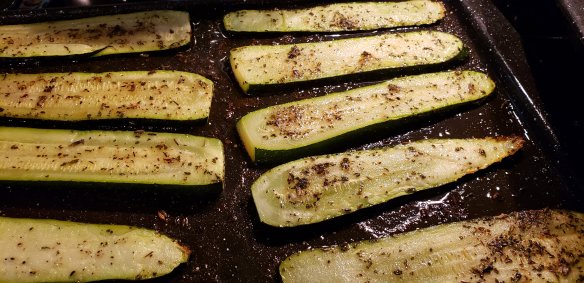 Slice long thick slices of the zucchini, toss in the olive oil and herb mix. Roast in oven for 30 minutes at 375F, or until well cooked but not soft and squishy. You need to be able to lift them to layer them.