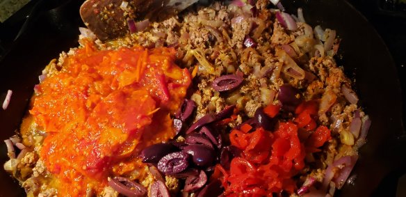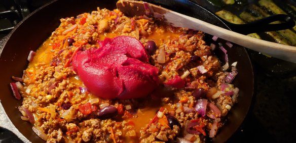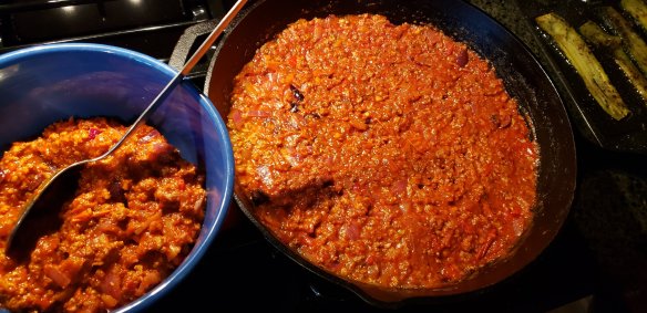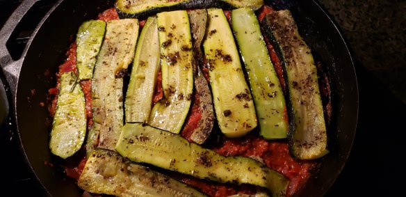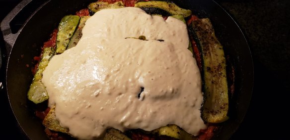 Fry the onions in the oil and butter mix, add the ground beef when translucent. Cook through until mince is cooked. Add the cooked tomatoes (you can use raw but it will take longer to cook) and herbs and spices. Simmer, adding the rest of the ingredients and cook until a rich red colour. That’s how I know when it’s ready, food just kind of tells you by smell and how it looks. I used the same cast iron skillet for this dish, just removed half of the red sauce, then layered the zucchini and cheese sauce. Question is, what it the right order? I doubt it changes the flavour, but this should be fine. Top it with paprika, oregano and Herbs Provence then if you like, more sharp cheddar cheese or parmesan before baking for 30 minutes at 350F.