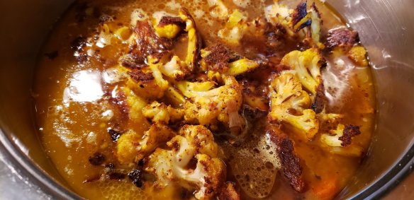 Add roasted cauliflower and veg and all the juices, add chicken stock. Only add water if you want a thinner soup. I added boiled water to the roasting trays and scraped out all the leftover bits as there is so much flavour left there.