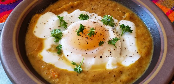 Bring to simmer, blend with blender stick, serve topped with sour cream or yogurt, or a poached egg, sprinkled with parsley to finish.