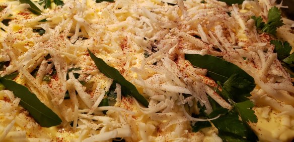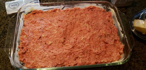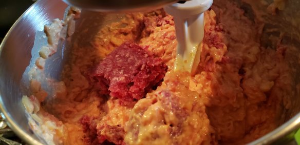 Beat the eggs in a mixer, add the diced onions to infuse the eggs. On the slowest setting, add the cream cheese, ground meat, spices, and the last of the ingredients. When mixed pour into a well buttered dish. This makes a nice large portion for work lunches. Bake for 25 minutes at 350F. Leave to set while making the spread to finish off your bake