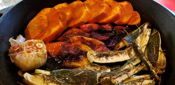 Here is dinner and plenty of leftovers to portion off for our lunch boxes the next work week. I’m not such a good meatloaf maker, it’s one of those bakes that always is never as good as I expect and never quite as browned inside as I’d like. So this is more a casserole bake but keto style with low carbs. I baked this alongside some roasted veggies. Courgette, yam, garlic head and mini peppers, each flavoured with different seasonings (in order of mention, dill, turmeric, ground pepper, chilli flakes).