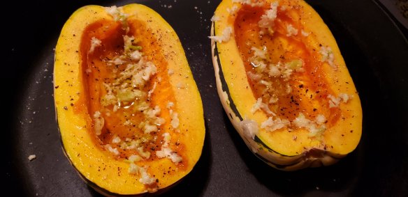 Although this takes a while to cook, around 45 minutes at 400F, I suggest you save it for a time you have guests and make enough for 1 boat each. You could use any squash that when sliced, is the perfect receptacle for these few simple ingredients. Mum, if you’re reading this, I know you will add a sprinkle of nutmeg as a finishing touch.