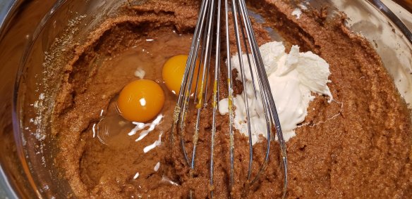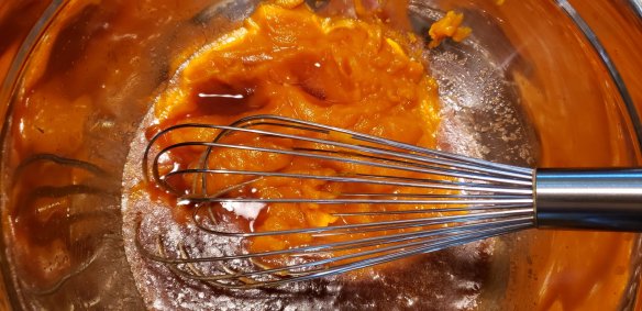 Stir in the pureed pumpkin, add essences, eggs, cream, dry ingredients and whisk until mixed.