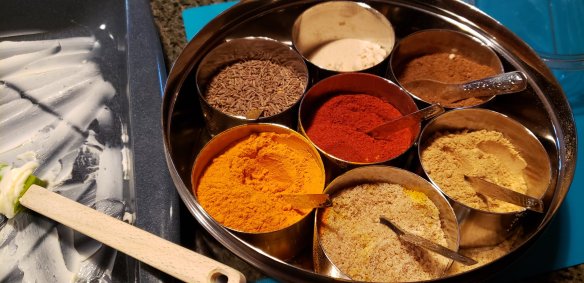 - Variety of whole spices: curry leaves, cumin, caraway, mustard seed, fenugreek, cardamom, 1/4 tsp each
