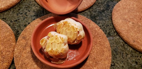 - If you like, I added an impromptu 2 head’s of garlic to bake in a separate garlic roaster to add to soup once pureed, but totally optional! (I figured the oven was on anyway)