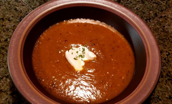 To summarise the recipe you will be roasting all the veggies in a spiced buttered pan then blending them with stock and heating it prior to serving. Top with some sour cream and cilantro.