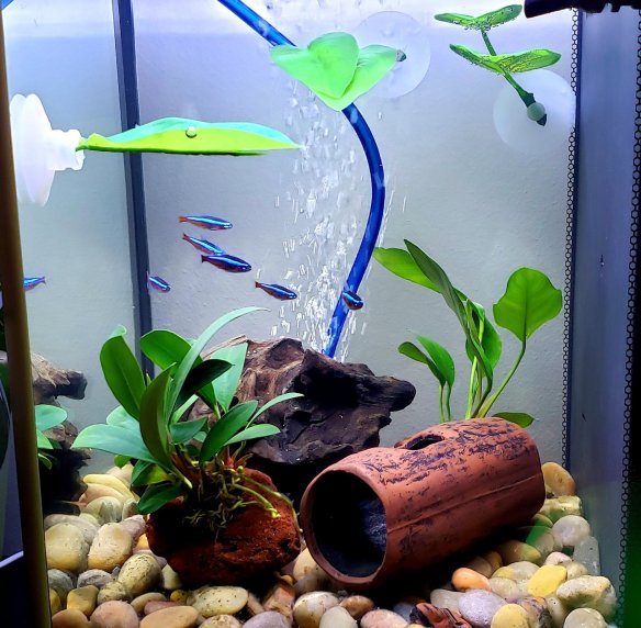 I have set up a little aquarium in my work office. Meet The Divas! They are 6 Tetras that are just too cute. There is also an African dwarf frog. I’m thinking of calling him Elvis. Elvis and The Divas sound kinda fun. Especially as I heard him sing for the first time. It was amazing! Luckily my office is quiet so I heard it.
