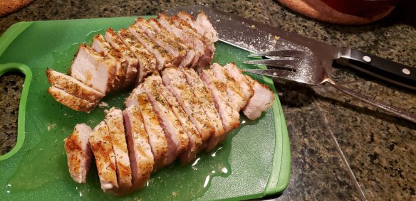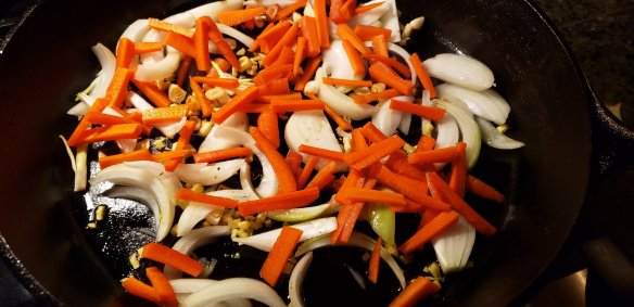 If you have two lovely pork chops – or even chicken breasts will be good; marinade them in the few goodies detailed below while prepping the veggies, then grill them in the oven while cooking the veg on the stove top.