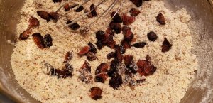 - 11 soft black mission figs, chopped, stirred into flour or you could try soaked raisins, drained before adding