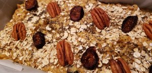 - Top with oats, chia seeds, pecan nuts and slices of fig