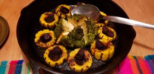 - Add the remainder of the roasted butternut to your cooked veggies, scraping in all the delicious residue oils and spices