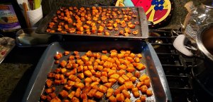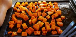 - Place your diced butternut on cookie sheets, roll in spices and coat with oil and roast until nicely done and browned about 30-40 minutes on 375⁰F