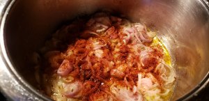 - Melt the butter, stir fry the shallots/onions, celery, bell pepper until cooked through, add diced apple