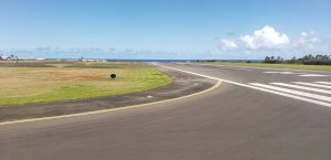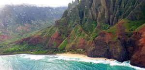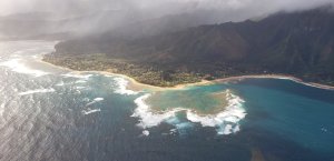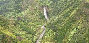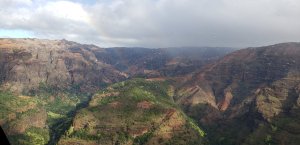 We had an incredible 45 minute helicopter ride over the Kauai island, our 40th anniversary treat to ourselves in lieu of meals out. Well worth it! From waterfalls to arid mountains and dramatic cliffs. It was pelting with rain and buffeting at times, but an amazing experience. This is the entrance to the Princeville airport where there are flights to hop to the other islands.