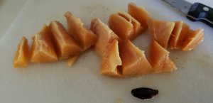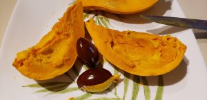 These are the last two fruit that I would like to share as well that we discovered. The first is a Sapodilla fruit. You need to wait until it is very soft before peeling it and it has the flavour of a custard apple crossed with papaya, and very very good! It is native to Mexico as well as Central America.