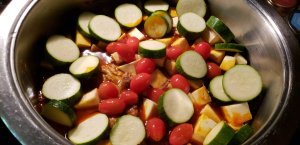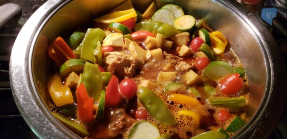 - Start up pot again to slow simmer, gently stir in veg, place lid on and leave to simmer another 30 to 45 minutes