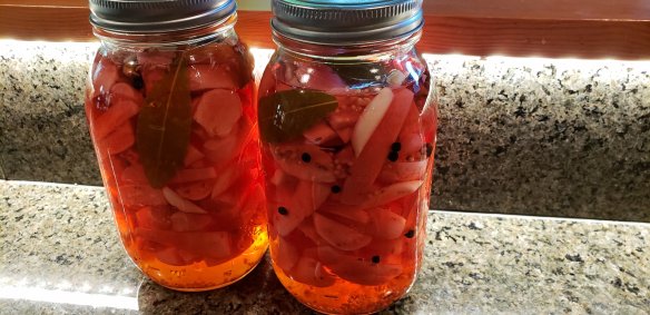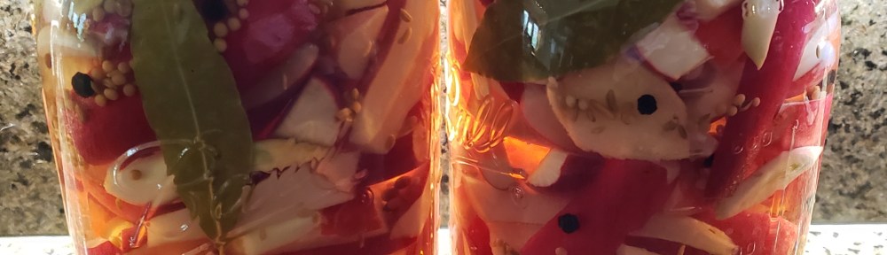 We have radish, lots of radish! My sweetie has been harvesting his prolific crop of French Breakfast radish. It’s the perfect balance of sweet at first crunchy bite, then peppery with a mustardy overtone. What do you do when you have an abundance of veg – make pickles of course!