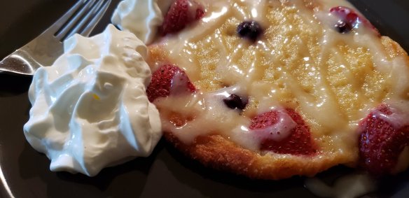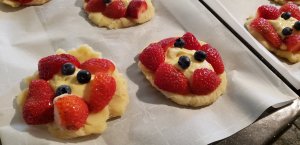 Melt the mozzarella and cream cheese 1 minute or until soft and pliable and mix well together. Add dry ingredients (it’s best to have these dry ingredients all measured out in a bowl together, as you need to work quickly with this dough). Mix well with a wooden spoon once cheese mix is out the microwave, add the flours and lastly the egg. I find it best to use your hands and knead until pliable and … well … dough like! Divide into 8 balls and flatten into rounds and place on baking trays lined with parchment paper. Top with filling and add 1/4’d strawberries around the filling. Top with blueberries if you like! They do spread out quite a bit, so I used 2 baking trays.