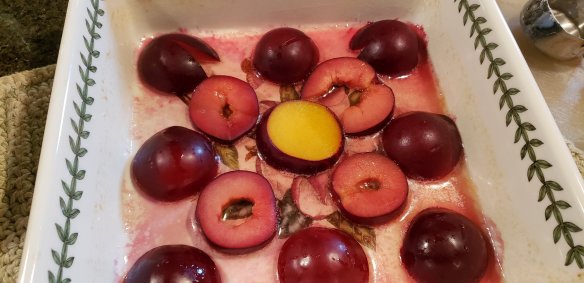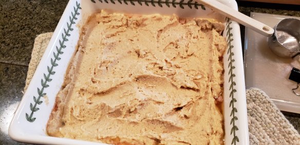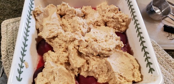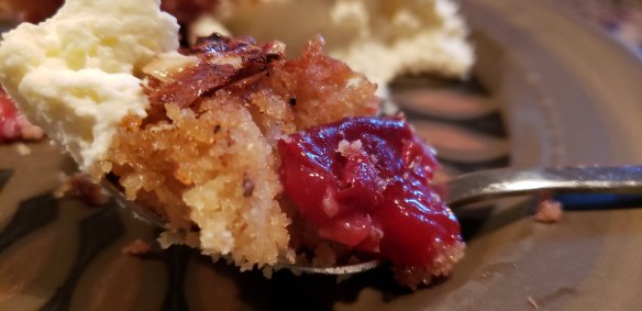 I never had fresh berries so for this recipe I used a few plums. They were not quite ripe either! Anyhow, the gist of this recipe is to bake your fruit in butter while you prep the batter. Add the light scone-like topping, flaked almonds, more spices, bake and you’re done! Delicious with a cup of coffee and topped with whipped cream.