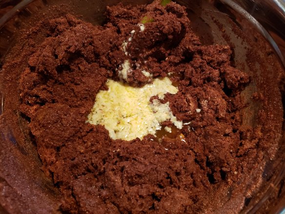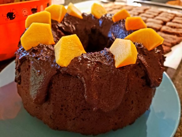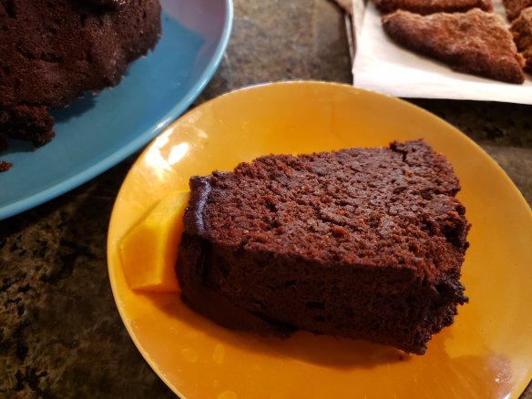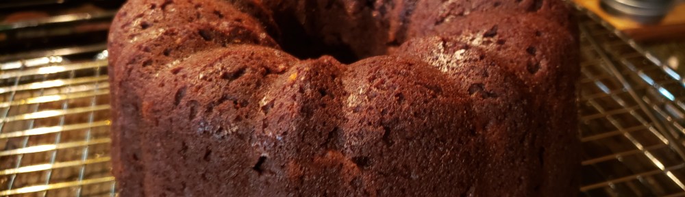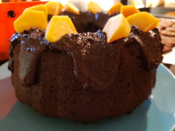 This is a nice moist slightly heavy heavenly dark chocolate pound cake with a lovely orange flavour. I used a bundt pan. If you split this into 2 loaves be sure to lessen the bake time. I blitzed 2 tiny mandarins in (or use a small orange) – use sugar-free orange essence if you prefer.