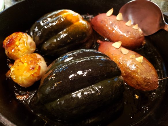 And here we have roasted garlic bulbs, acorn squash and roasted yam dinosaurs just for roasted goodness fun. (tops of garlic on halved yam).