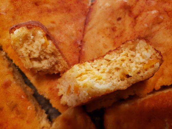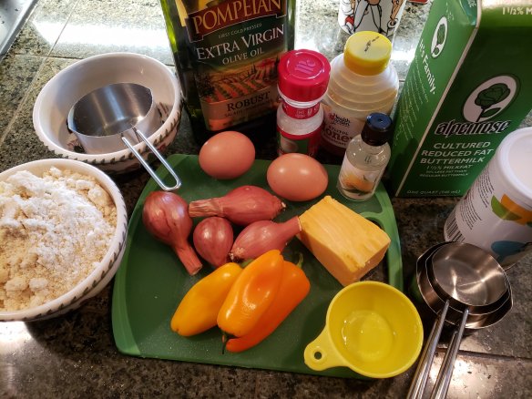 In this keto “corn bread” we’ll sub the corn kernels with chopped yellow peppers and add an optional tsp of pure corn extract if you have – it’s pricey but worth it and lasts a long time! The almond flour gives a lovely corn meal texture. This is a moist cheesy bread and really delicious. You could also bake these in a muffin pan and cut the baking time.