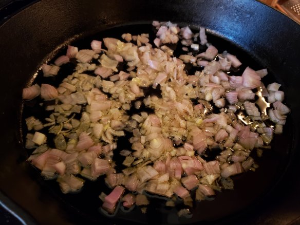 - Heat oil and butter in a cast iron skillet or Dutch oven and saute diced veggies until soft and translucent. Let cool while you prepare your other ingredients.