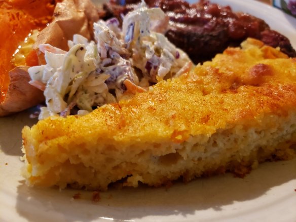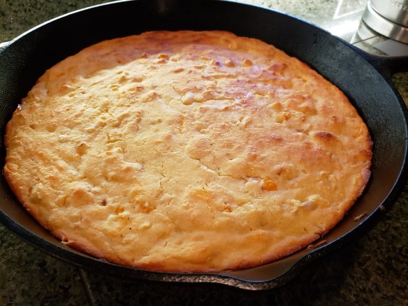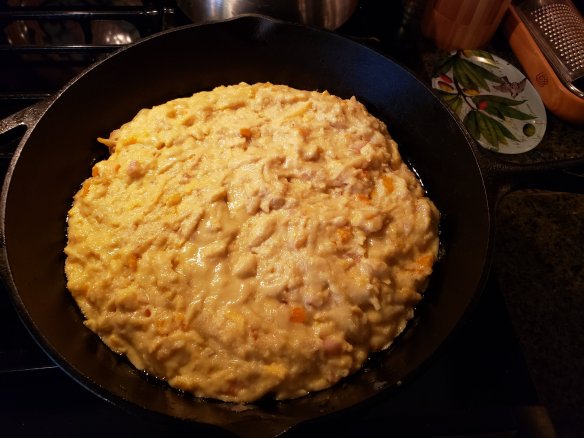 - Scrape in the cooled veg and buttery oil mix into the batter and mix gently. Turn batter into the skillet making sure your skillet is still well greased and bake at 375⁰ F for 25 to 30 minutes until lightly brown on top.