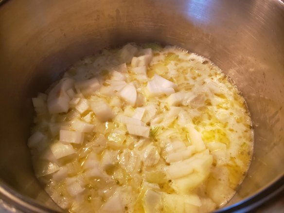 - Melt butter until sizzling, add diced onions