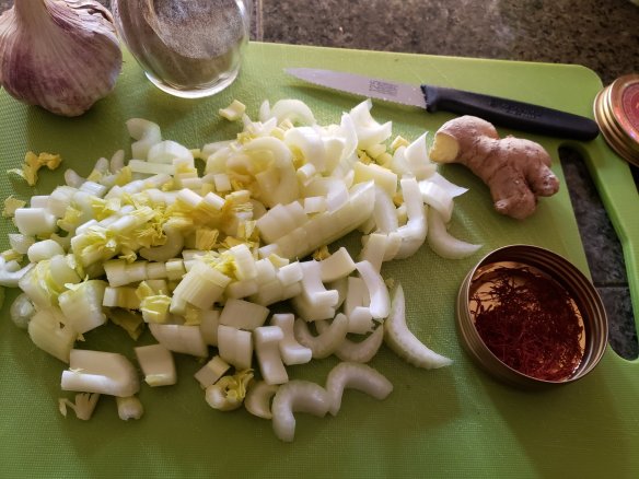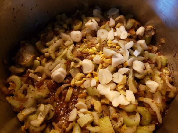 - When the colour of the spices look warm and the air is fragrant, add your diced celery