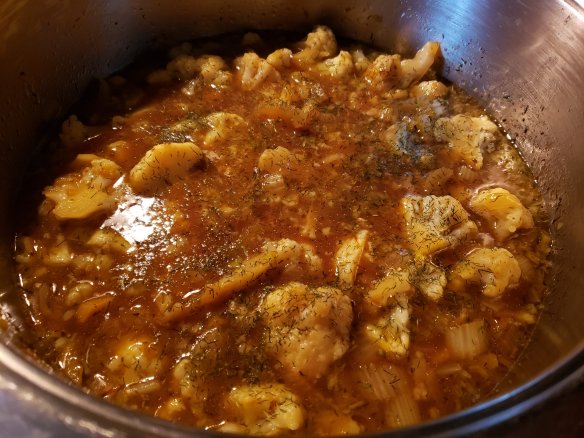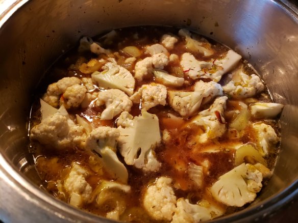- When the cauliflower looks well coated with spices after a few stirs, pour in the stock (boiling water will do fine here too, you can add a bit of powdered onion and garlic and it will be tasty and yummy too) until all the vegetables are well covered with a tiny bit of broth to spare so that your veggies won’t peek out