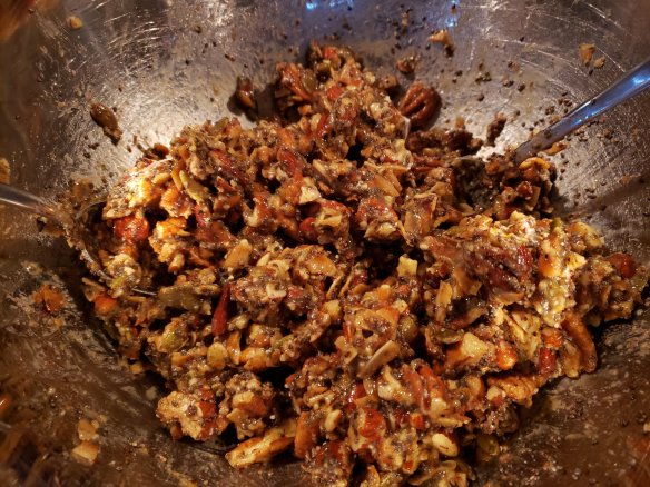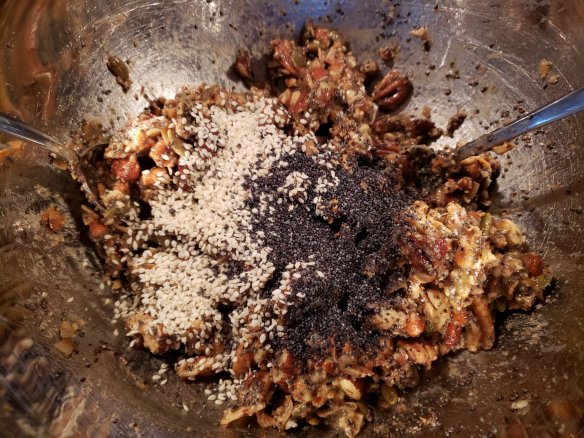 In a large bowl, mix the nuts and seeds, almond butter and tahini, add the sweetener and protein powder. Taste check!
