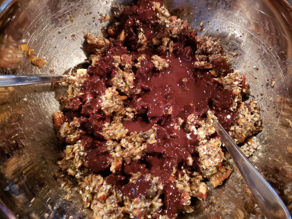 If the chocolate is completely melted, add to nut mix and stir in quickly. If you feel your mix is too wet add a bit of almond flour or other nut flour until you feel happy with the mix. I really winged the measurements and the mix came out great!