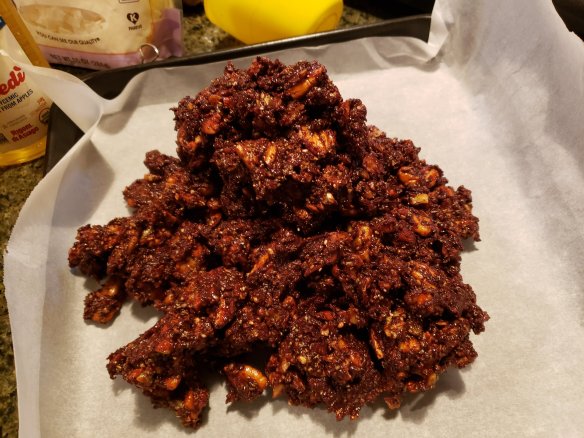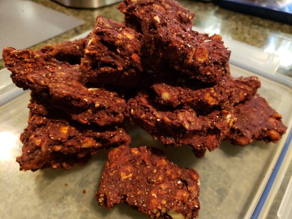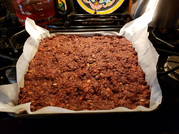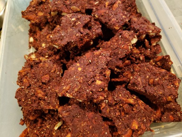 When cooked remove from oven and let cool on a rack for 1 hour do *not* remove from pan. Then refrigerate *in pan* for two hours before breaking into bars or crumbled for granola. Store in fridge.