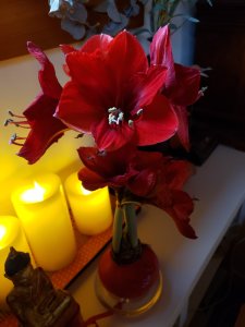 This amaryllis was given to me by a neighbour and is blooming at last!