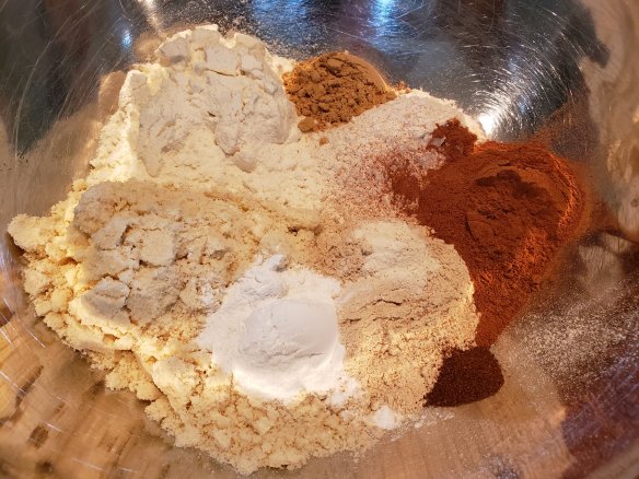 - In another bowl mix together all the dry ingredients, including the spices. Whisk.